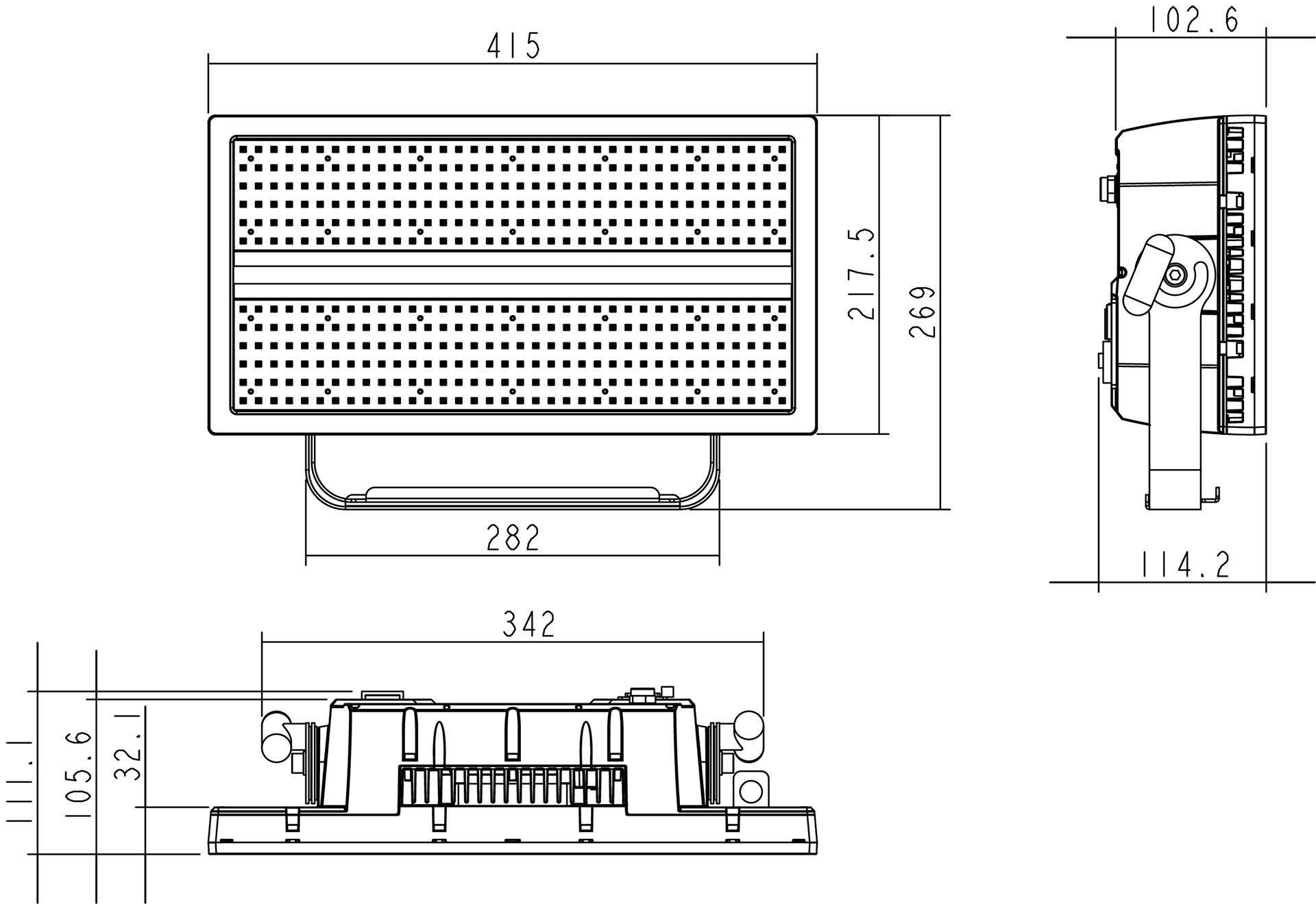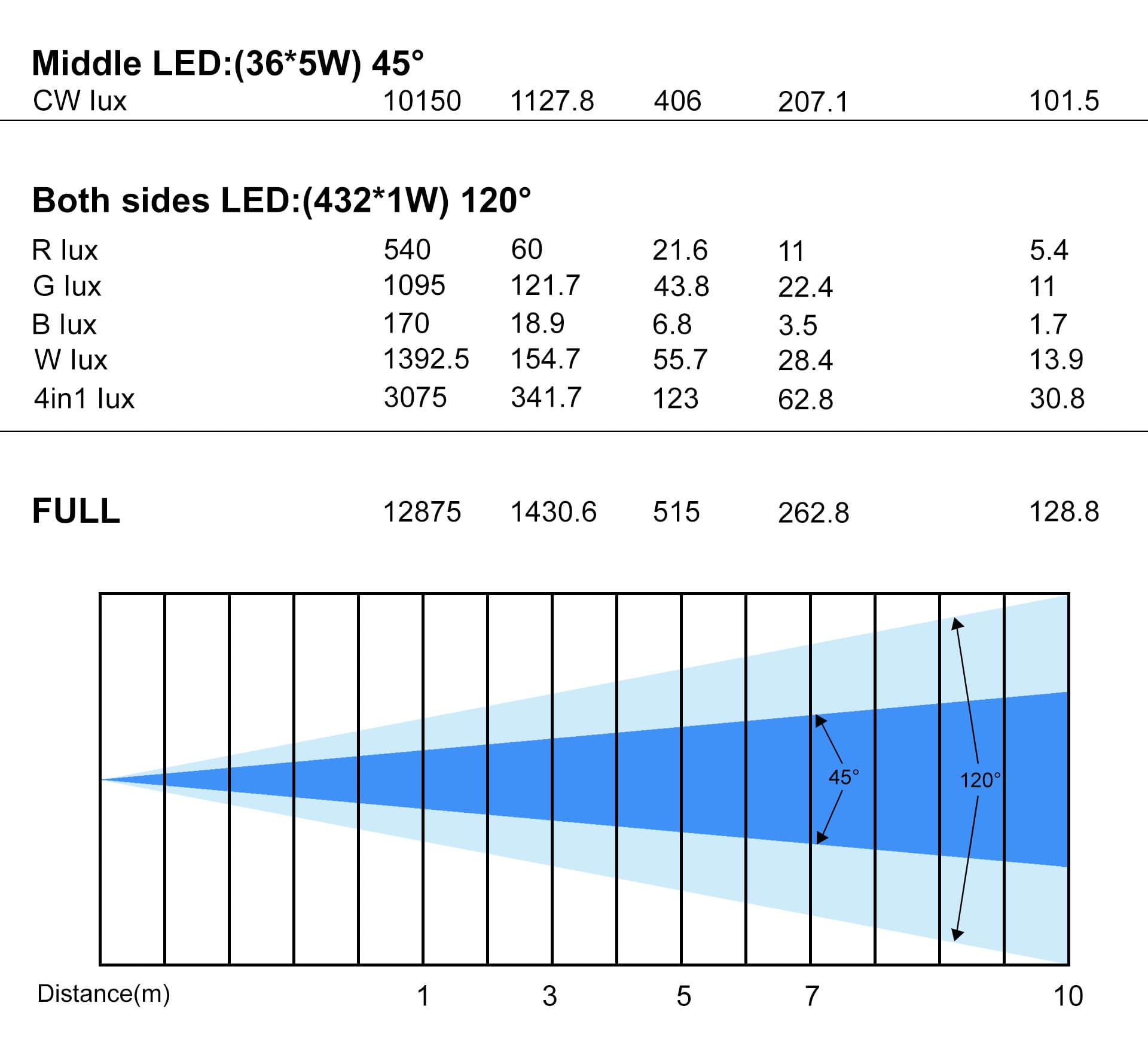 光源:两边432颗3838 1W RGBW灯珠;中间36颗5W灯珠;